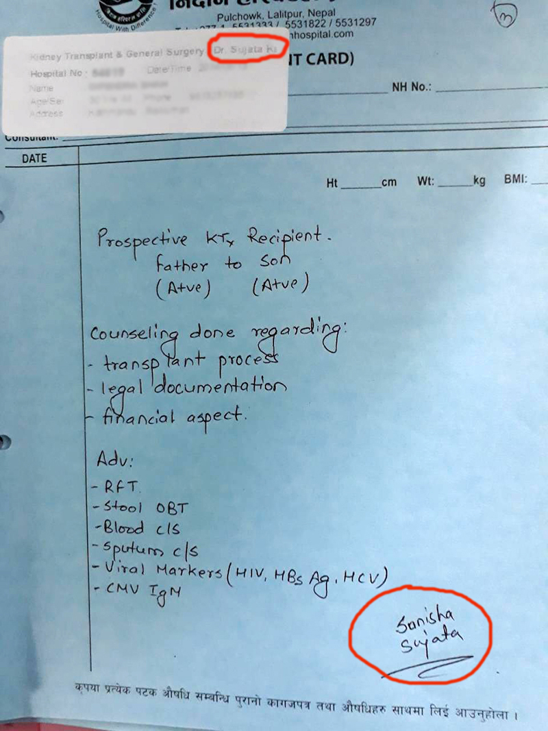 केन्द्रमै मिर्गौला प्रत्यारोपण गराएका एक बिरामीको ल्याब रिपोर्टमा ‘डाक्टर’ सनिशा कार्कीको ओपिडीबाट बिरामीलाई निदानमा ल्याब जाँच गराउन लगाइएको समाचार त्यतिबेला स्वास्थ्यखबरले प्रकाशित गरेको थियो। कार्की डाक्टर नभएर केन्द्रमा मिर्गौला प्रत्यारोपण कोअर्डिनेटरका रुपमा कार्यरत नर्स थिइन्।