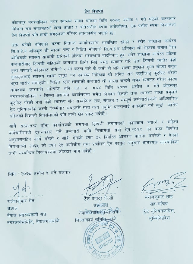 नेपाल स्वस्थ्यकर्मी संघ बाँकेका अध्यक्ष टेकबहादुर केसी, संघको नगरकार्यसमिति अध्यक्ष राजेशकुमार सेन र ट्रेड युनियन कांग्रेस लुम्बिनी प्रदेशका सह–सचिव सरोजकुमार शाहले मंगलबार संयुक्त रुपमा विज्ञप्तिमा जारी गर्दै कार्यालयको टिप्पणी च्यातेको र महिला कर्मचारीमाथि दुर्व्यवहार गरेको भन्दै खनाललाई कारबाहीको माग गरेका छन्।