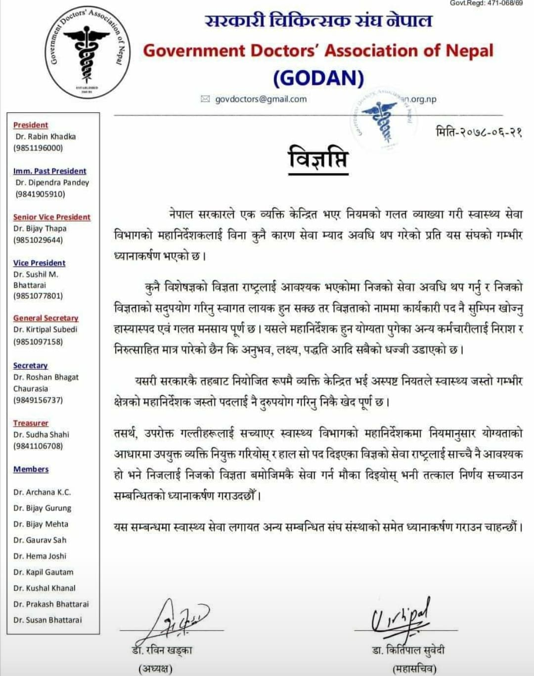 ‘कुनै विशेषज्ञको विज्ञता राष्ट्रलाई आवश्यक भएकोमा निजको अवधि थप गर्नु र निजको विज्ञताको सदुपयोग गरिनु स्वागत लायक हुन सक्छ तर विज्ञताको नाममा कार्यकारी पद नै सुम्पिन खोज्नु हास्यास्पद एवं मनसाय पूणृ छ। यसले महानिर्देशक हुन योग्यता पुगेका अन्य कर्मचारीलाई निराश र निरुत्साहित मात्र पारेको छैन कि अनुभव, लक्ष्य, पद्धति आदि सबैको धज्जी उडाएको छ, ’ संघद्वारा जारी विज्ञप्तिमा भनिएको छ।