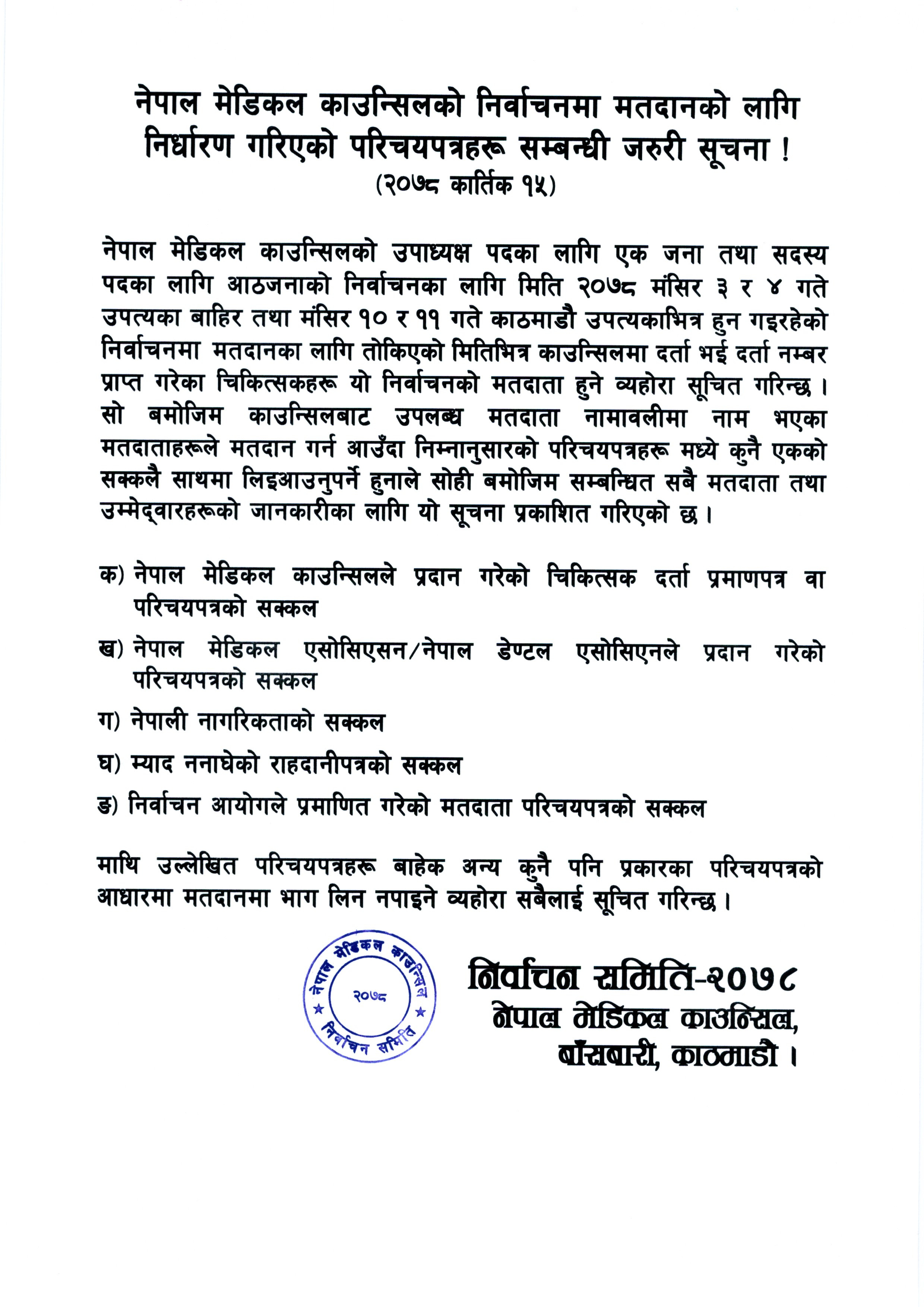 काठमाडौं- नेपाल मेडिकल काउन्सिलको निर्वाचन मतदानको लागि निर्धारण गरिएको परिचयपत्रहरू सम्बन्धी सूचना सार्वजनिक गरेको छ। काउन्सिलले सार्वजनिक गरेको सूचना अनुसार काउन्सिलको निर्वाचनमा मतदान गर्ने जाने मतदाताले मतदान गर्न जाँदा परिचय खुल्ने परिचयपत्र अनिवार्य बोक्नु पर्ने हुन्छ।