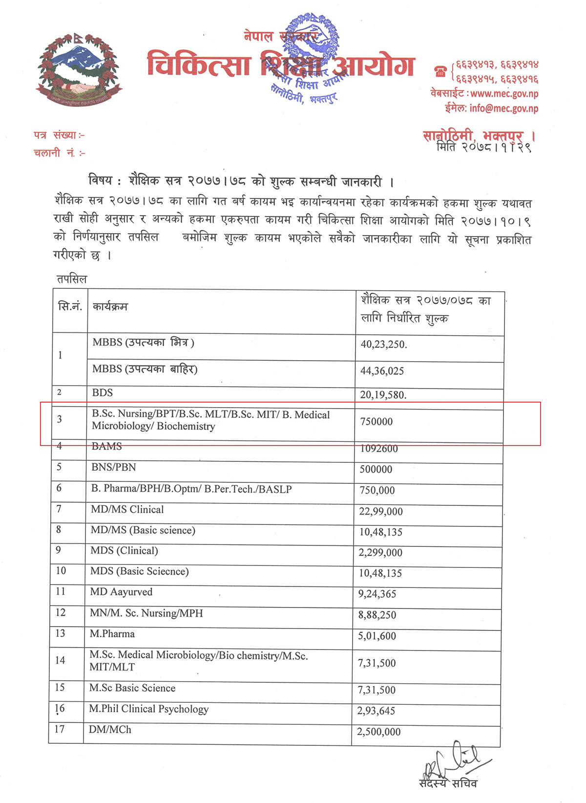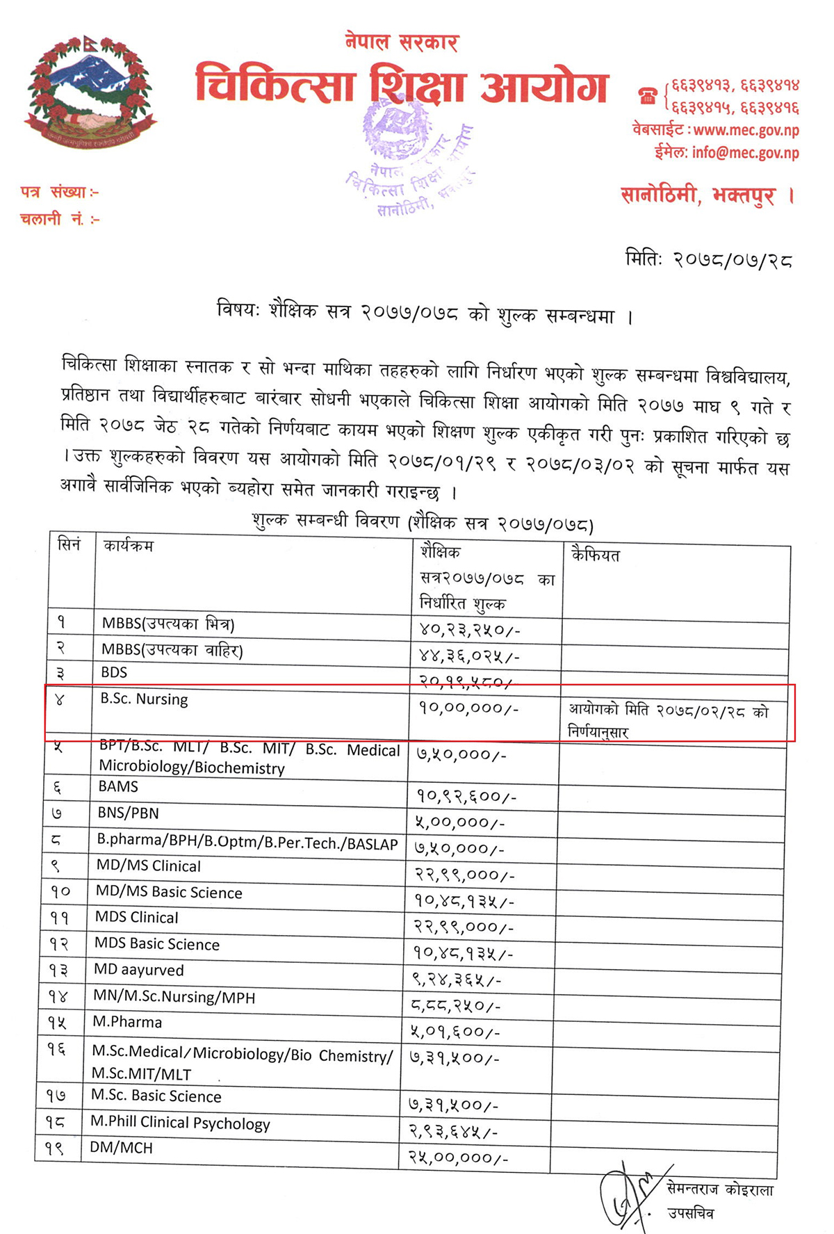 तर गत बैशाखमा प्रकाशित सूचना र आइतबार प्रकाशित सूचनामा बिएस्सी नर्सिङको शुल्क फरक देखियो।