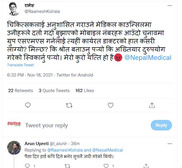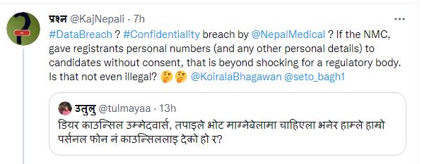 काउन्सिललाई आवश्यक पर्छ भनेर उपलब्ध गराइएको नम्बरमा उम्मेदवारहरुले भोट माग्न थालेपछि काउन्सिलबाट नै नम्बर लगायतका विवरण उम्मेदवारहरुलाई उपलब्ध गराएको भन्दै चिकित्सकहरुले सामाजिक सञ्जालमा विरोध गर्न थालेका छन्।