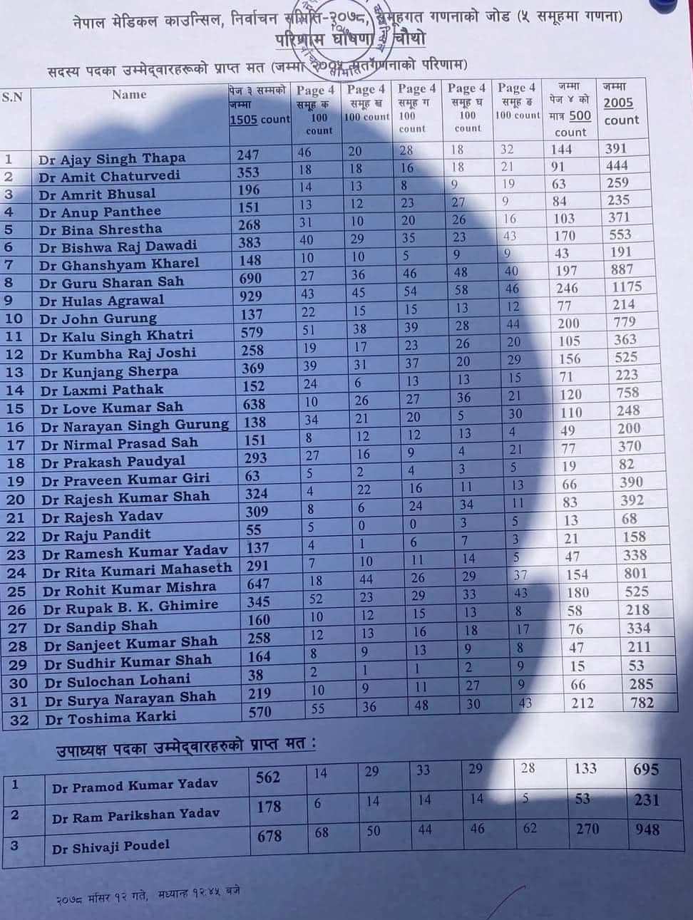यसैगरी, सदस्यमा डा हुलास अग्रवालले सबैभन्दा बढी मत ल्याएका छन्। उनको ११७५ मत आएको छ। त्यसपछि डा गुरुसरण शाहको ८८७, डा रोहित कुमार मिश्रको ८०१, डा तोसिमा कार्कीको ७८२, डा कालुसिंह खत्रीको ७७९ र डा लवकुमार साहको ७५८ मत आएको छ।