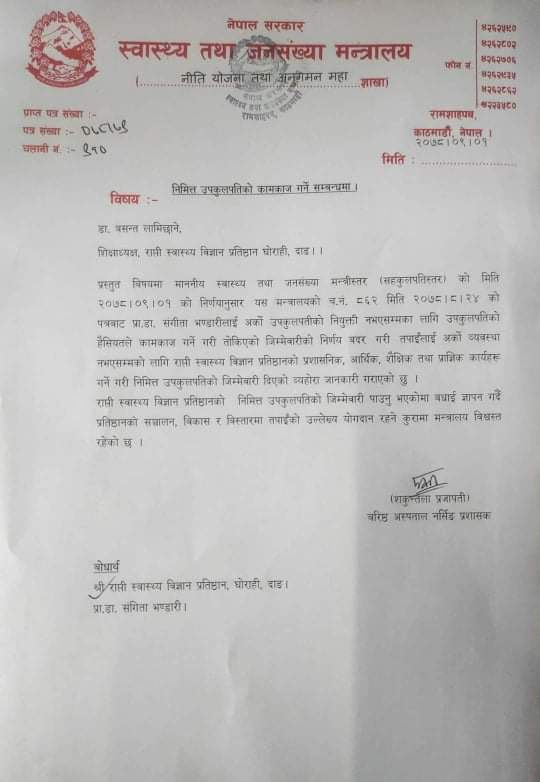 काठमाडौं- राप्ती स्वास्थ्य विज्ञान प्रतिष्ठानको निमित्त उपकुलपतिको जिम्मा डा वसन्त लामिछानेले पाएका छन्। स्वास्थ्य तथा जनसंख्या मन्त्रालयले डा लामिछानेलाई आज निमित्त उपकुलपतिको पत्र दिएको हो।