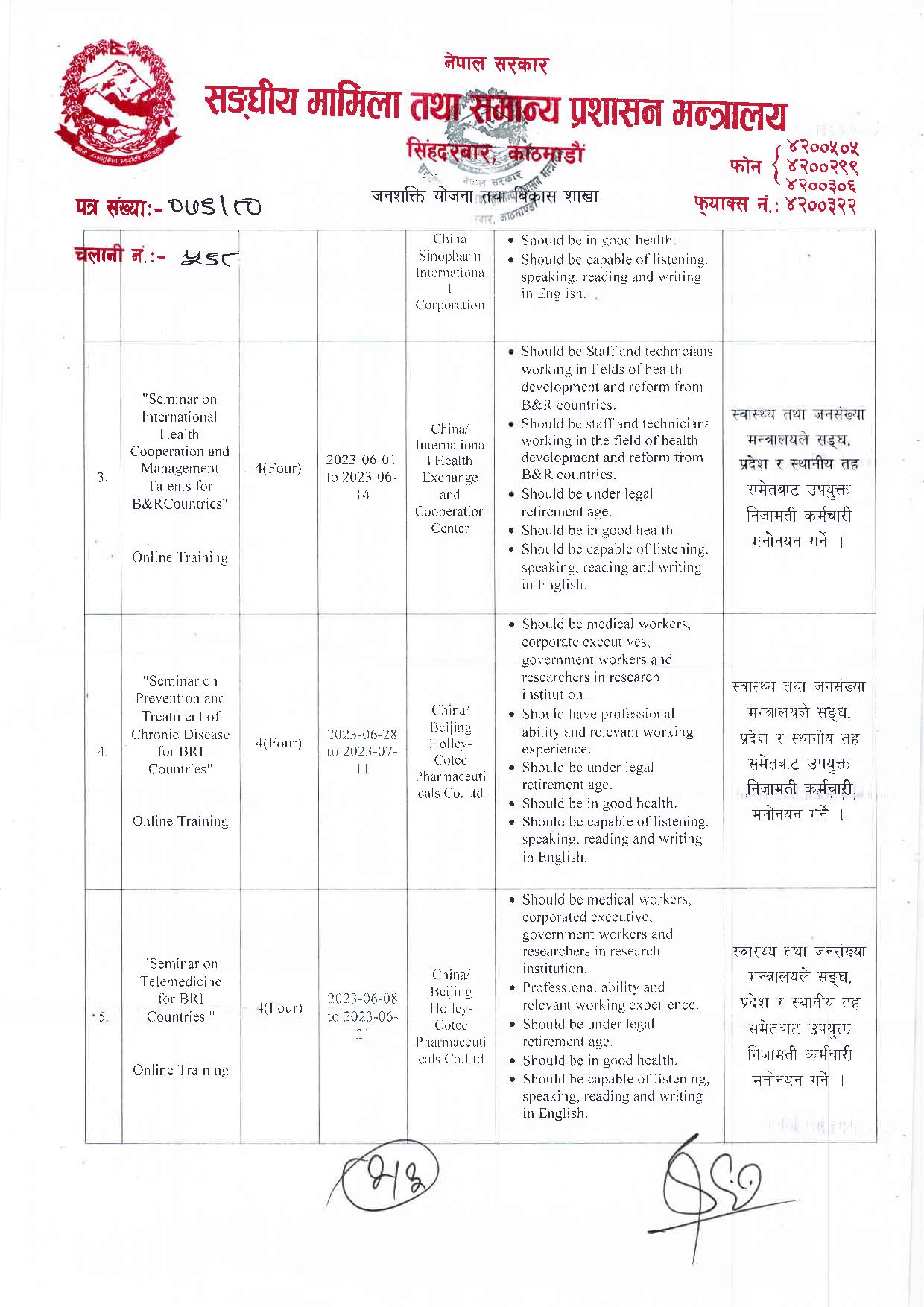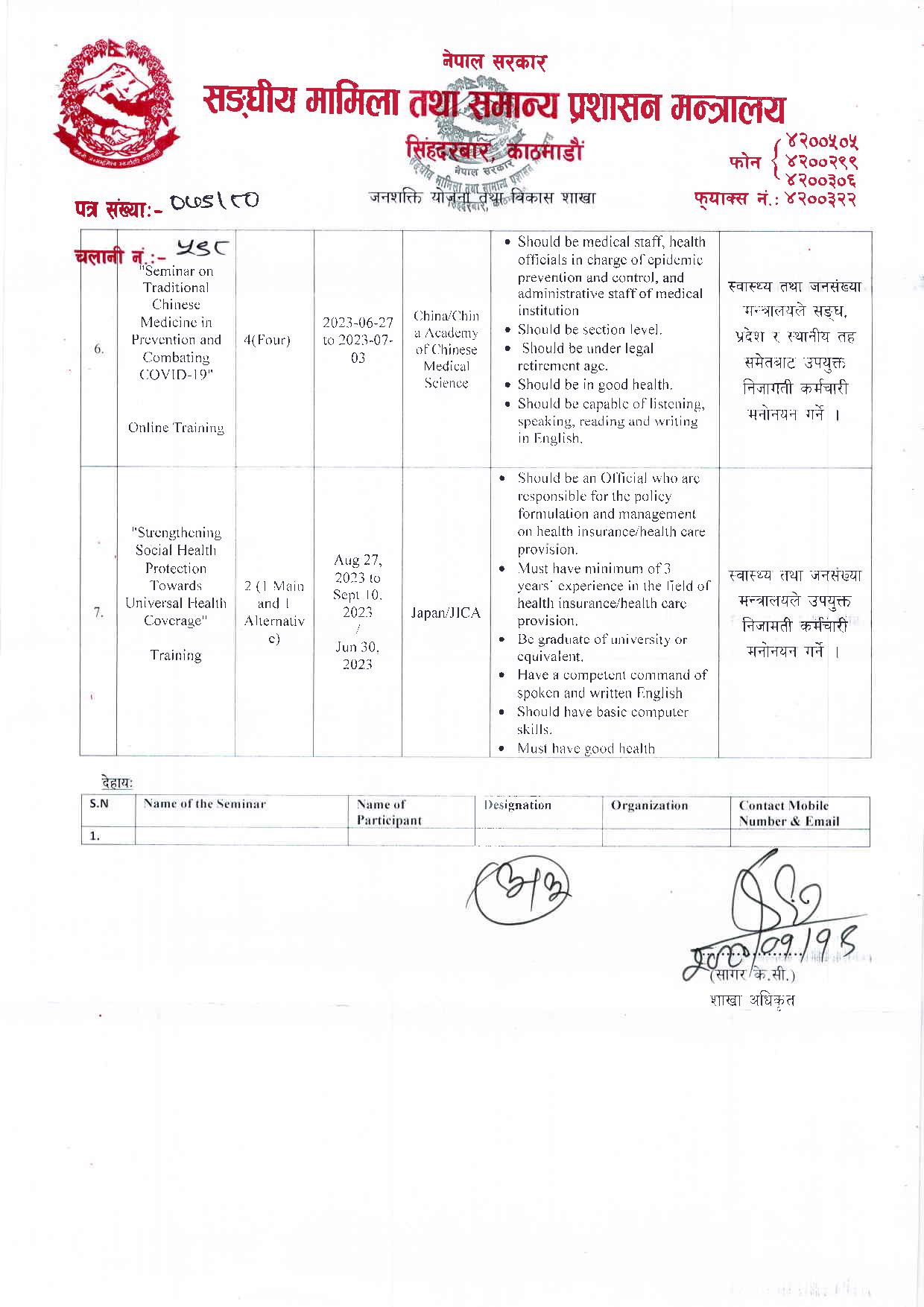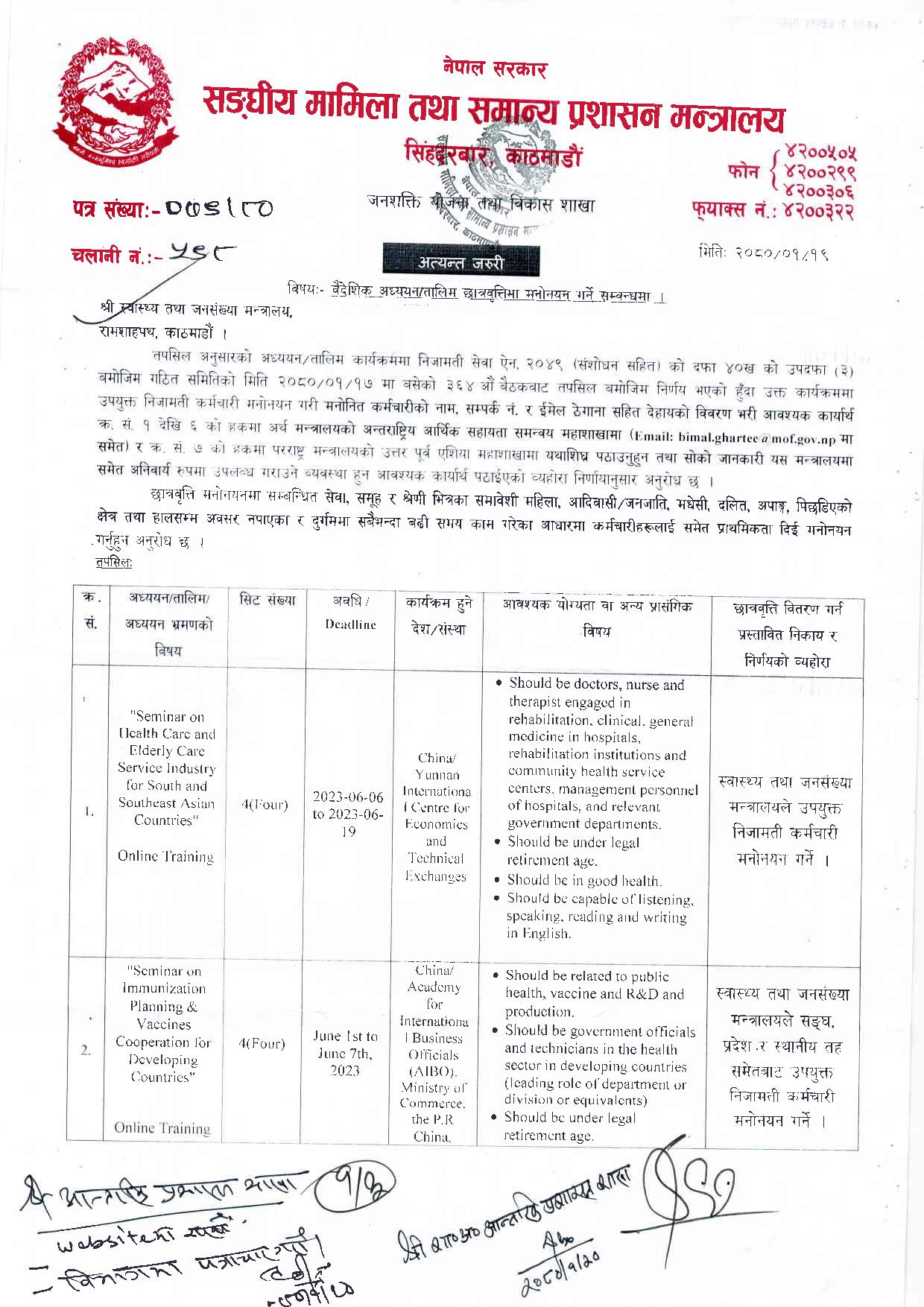 संघीय मामिला तथा सामान्य प्रशासन मन्त्रालयले स्वास्थ्य तथा जनसंख्या मन्त्रालयलाई पत्र पठाउँदै चीनबाट २४ र जापानबाट २ जनाका लागि छात्रवृतिमार्फत तालिम अध्ययनमा सहभागी हुन सक्ने उल्लेख गरेको छ।