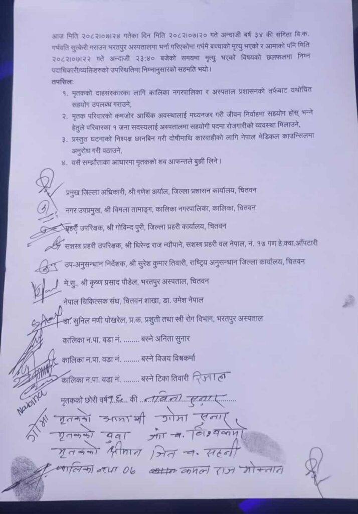 यस्तै, मृतकको दाहसंस्कारका लागि कालिका नगरपालिका र अस्पताल प्रशासनको तर्फबाट सहयोग उपलब्ध गराउने, घटनाको निस्पक्ष छानबिन गरी दोषीमाथि कारबाहीका लागि नेपाल मेडिकल काउन्सिलमा अनुरोध गरी पठाउने सहमति पत्रमा हस्ताक्षर भएको छ।