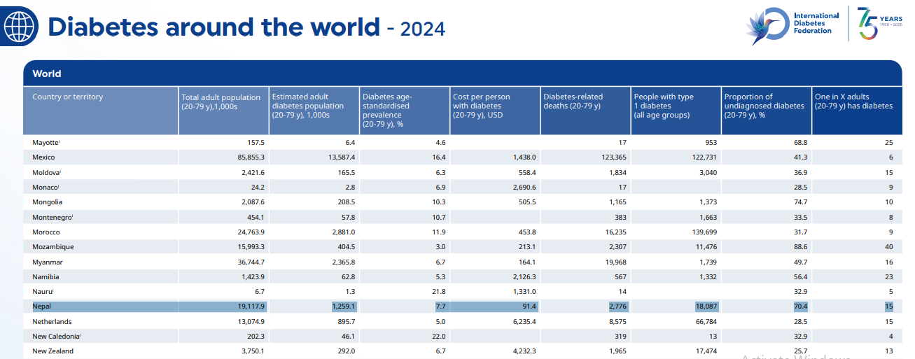 ५ मध्य ४ मधुमेहका बिरामी कम र मध्यम आय भएका देशका रहेको तथ्यांकमा उल्लेख छ। सन् २०२४ मा विश्वमा मधुमेहका कारण ३४ लाख मानिसको मृत्यु भएका थिए। अनुमानित करिब ४३ प्रतिशत अर्थात् २५ करोड २० लाख मानिसहरुको मधुमेह निदान भएको र करिब ९० प्रतिशत त कम तथा मध्यम आय भएका देशको रहेको फेडेरेशनले जनाएको छ।