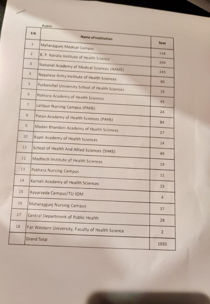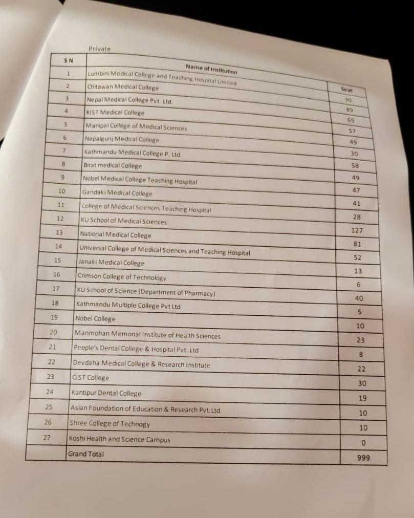 आयोगको आज बसेको बैठकले सरकारी र निजी कलेजमा पिजी, एमडी/एमएस लगायत विषयका लागि सिट निर्धारण गरेको हो।सरकारी तर्फका १८ कलेजलाई १ हजार ३१ र निजी तर्फका २७ वटा कलेजलाई ९९९ गरी २ हजार ३० सिट निर्धारण गरेको छ।