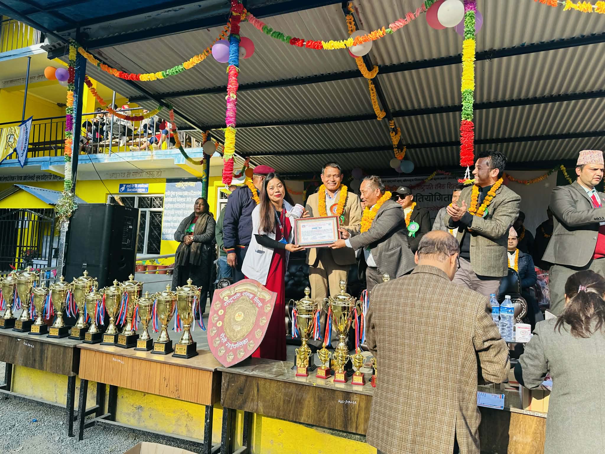 यसै वर्ष सम्पन्न भएको पाँचौ राष्ट्रपति रनिङ शिल्ड प्रतियोगिताको क्रममा हाम्रो विद्यालयमा कुनै पनि स्वास्थ्य चौकीका कर्मचारीको प्रत्यक्ष सहभागिता बिना, केवल विद्यालय स्वास्थ्य नर्सहरूको टिमद्वारा सम्पूर्ण स्वास्थ्य सेवा व्यवस्थापन गरिएको थियो।
